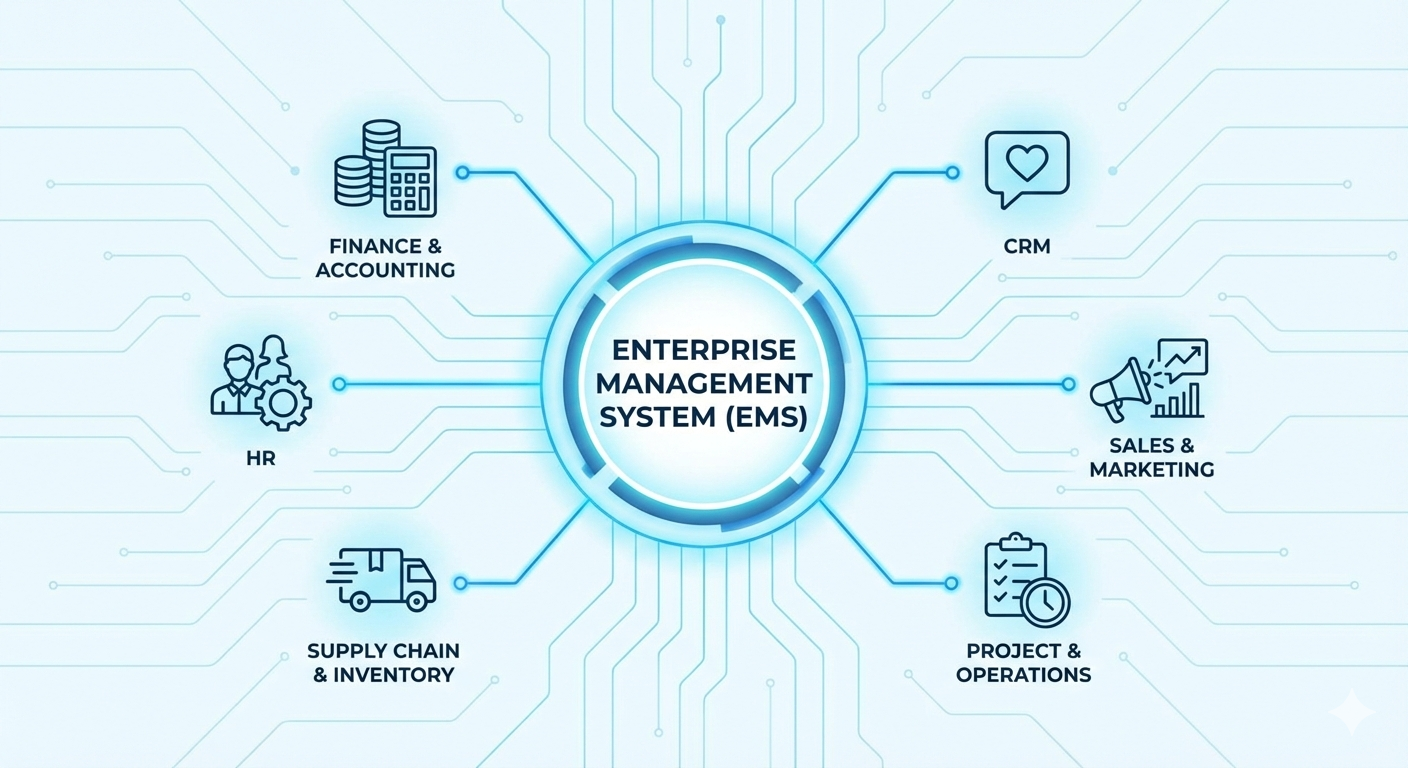 An Enterprise Management System (EMS) is an integrated software solution that helps businesses manage core operational processes through a single, unified platform. Instead of relying on multiple standalone tools, an EMS connects key business functions into one system.