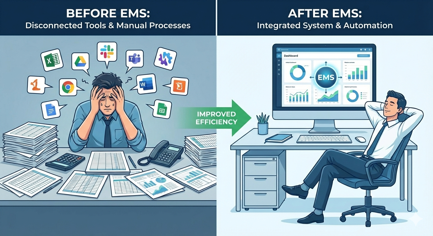 Using spreadsheets and disconnected software leads to duplicated work and inconsistent data. An EMS streamlines processes by connecting all departments within a single platform, allowing teams to work faster and more efficiently.